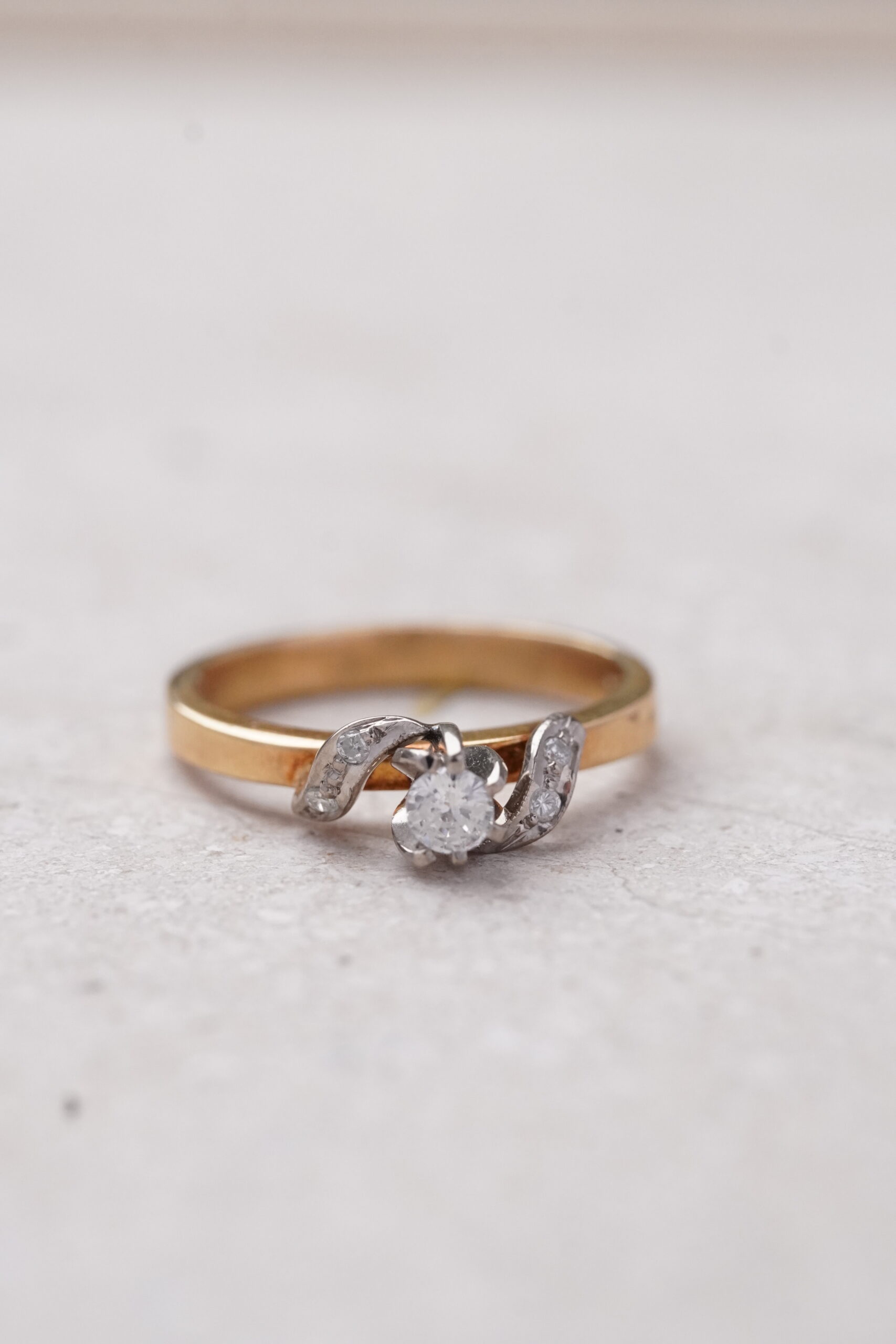 Diamante central de 0.10CT en oro amarillo con entrelazado en oro blanco y diamantes