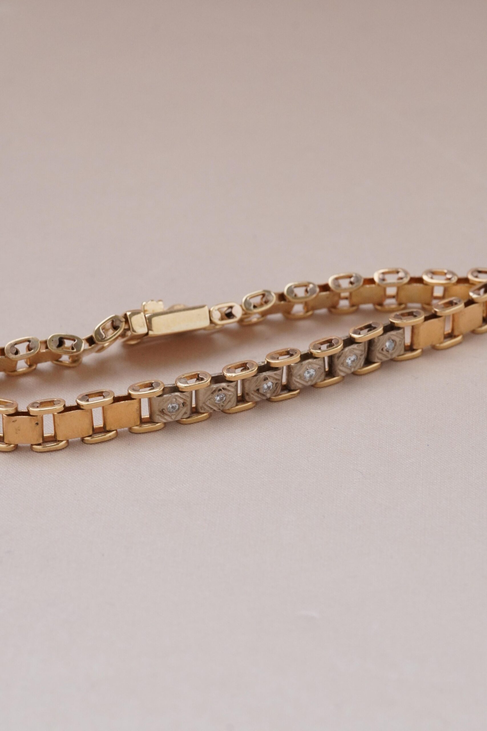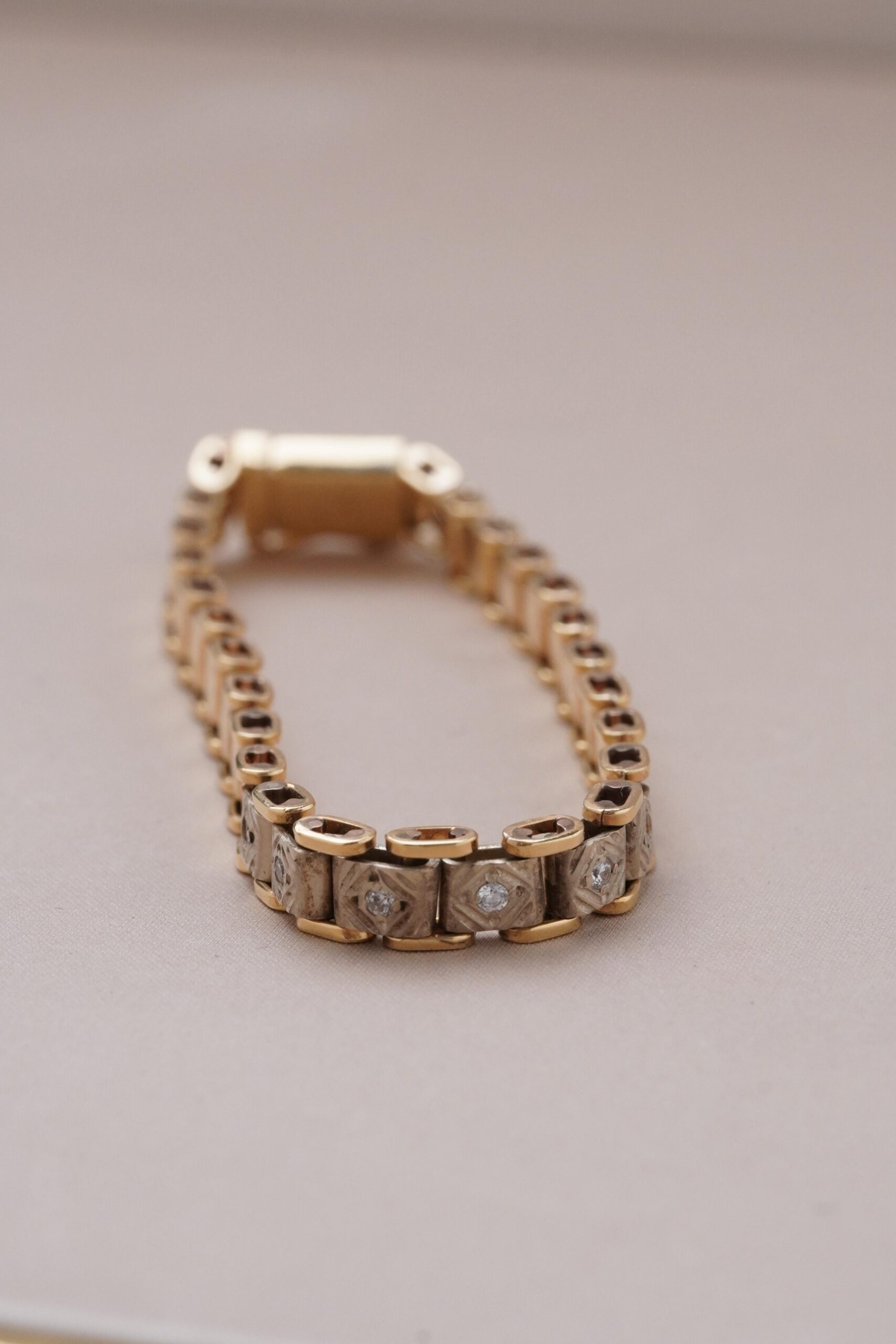 El detalle más especial de esta pieza está en la incorporación de diamantes finamente engastados, que aportan destellos de luz y glamour a cada movimiento. Estos diamantes, símbolo de pureza y eternidad, se convierten en protagonistas dentro del diseño, realzando la riqueza del oro y transformando una pulsera clásica en un accesorio deslumbrante y exclusivo.